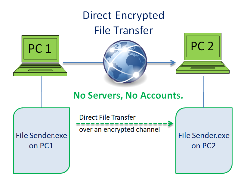 No servers are involved. Files are transferred directly from sender to recipient. Both sender and recipient use the free File Sender application for an encrypted, real-time file transfer.